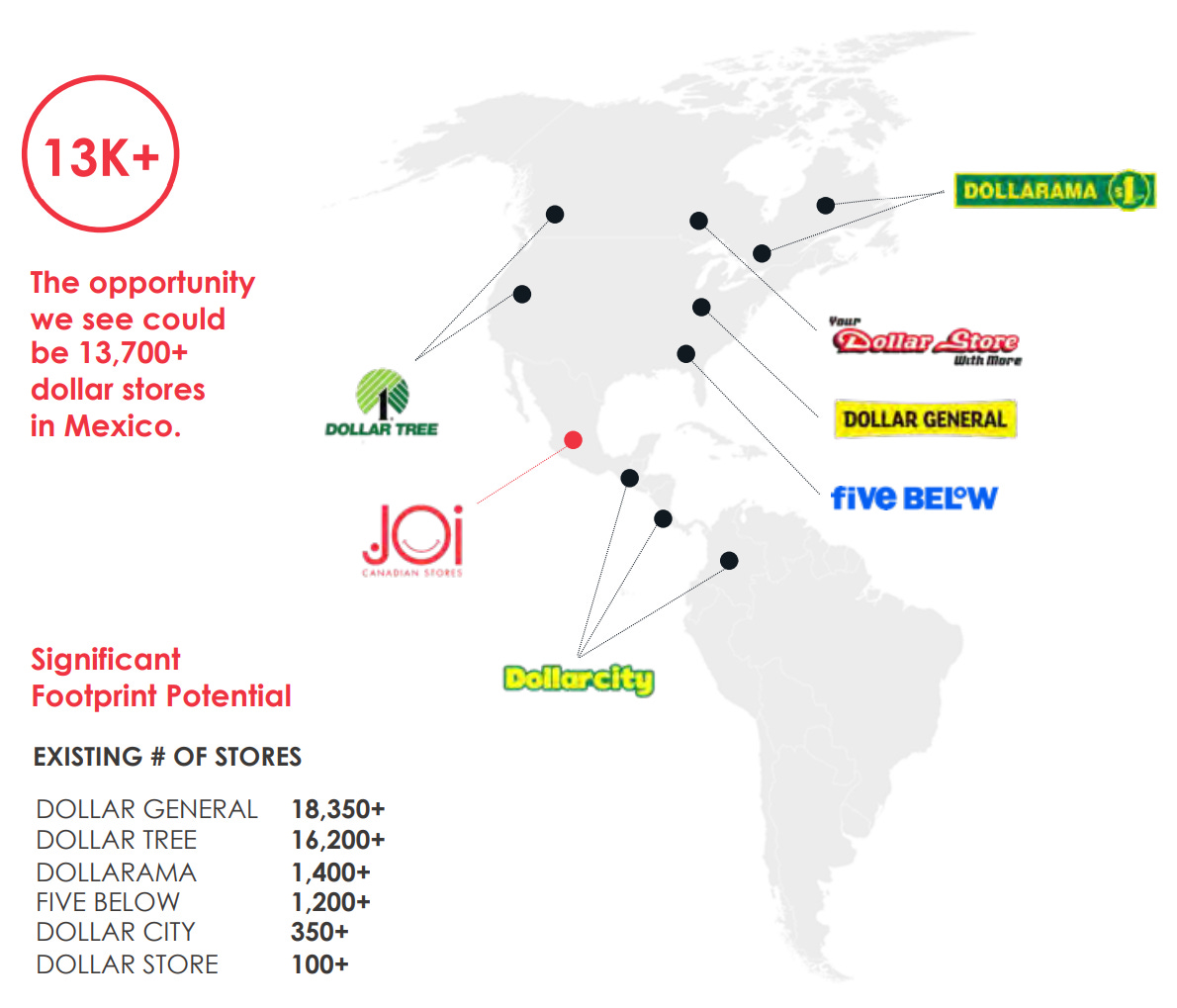 Just how big is the Dollar Store opportunity in Mexico? Pesorama, which already operates 23 JOi Dollar Plus stores across Mexico, estimated in their October 2022 Investor Presentation that there could eventually be room for “13,700+ dollar stores in Mexico”. This might be possible given how many dollar stores currently operate profitably throughout North America and LATAM (see below).
