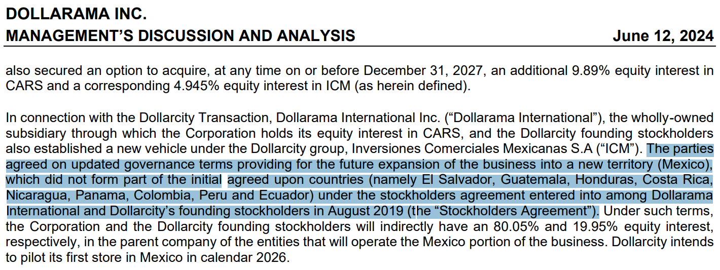 Is Dollarama late to the party, and catching up? What I find most interesting is how Dollarama announced their expansion plans into Mexico, leading me to believe that the Canadian dollar store juggernaut is possibly now playing catch-up. In Dollarama’s Q1 2025 Management Discussion & Analysis (June 12, 2024), management admitted that: